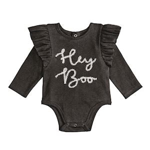 Cotton rib long sleeve crawler with applied tinsel sentiment. Inner leg snaps.