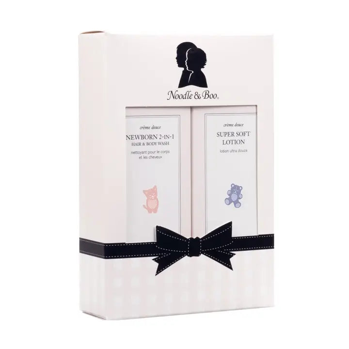 Our #1 bestselling gift set, and the perfect choice for newborns and babies. This trusted duo provides safe, gentle care for delicate skin from the very beginning. Set includes: • Newborn 2-in-1 Hair & Body Wash (8 oz) — A high-moisture, low-suds formula that gently cleans hair and skin without stripping natural moisture. Enriched with provitamin B5 and vitamin E, it helps keep hair shiny, scalp balanced, and skin hydrated and soft • Super Soft Lotion (8 oz) — A lightweight, silky lotion with sweet almond oil, allantoin, and vitamins E and C to nourish, protect, and soothe delicate skin, leaving it comforted and smooth after every bath • Gentle formulas developed especially for baby’s delicate skin • Mild enough for daily use, safe for newborns and babies with sensitive skin Why You’ll Love It • A thoughtful starter set with two newborn care essentials • Clinically tested for sensitive skin, safe from day one • Convenient sizes for daily use at home or on-the-go • Perfectly packaged as a gift for new parents Our Promise: • Hypoallergenic • Pediatrician-tested & Dermatologist-tested • Cruelty-free and Non-toxic • Made in USA • Free from Parabens, Phthalates, Sulfates, PPGs, and Dyes